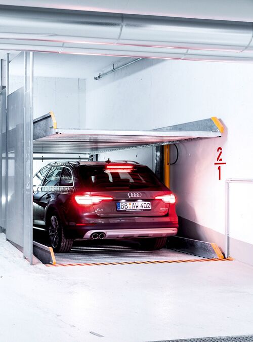 Le nouveau Parklift 450 offre un haut degré de flexibilité dans les dimensions de l'installation. Loin des paliers rigides de 15 cm dans les profondeurs des fosses et vers plus de variété. La profondeur des fosses du nouvel aménagement varie par paliers de 5 cm. Par rapport au modèle précédent, le Parklift 450 nécessite une hauteur de plafond inférieure de 5 cm sans réduire la hauteur des véhicules.