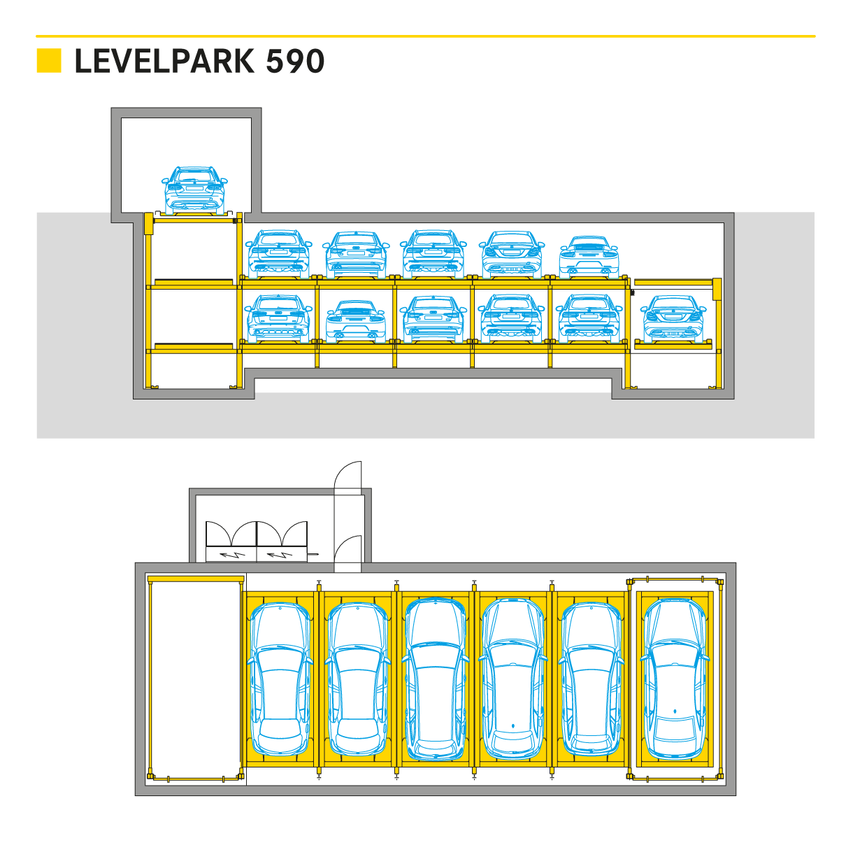 Dans un Levelparker 590 entièrement automatique, 10 à 50 véhicules peuvent stationner sur 2 à 5 niveaux de parking comprenant chacun une rangée de places. Un minimum de 2 et un maximum de 5 niveaux de parking souterrains peuvent être placés à droite ou à gauche du convoyeur vertical. Le déroulement du mouvement pour le transport des véhicules est effectué en cercle et par cycles d’élévations et de déplacements latéraux sur un minimum de 2 niveaux de parking. Un convoyeur vertical dessert le sas d’entrée qui est placé au-dessus des niveaux de parking. Il est aussi possible de prévoir un dispositif de rotation qui oriente les véhicules en marche avant pour la sortie.