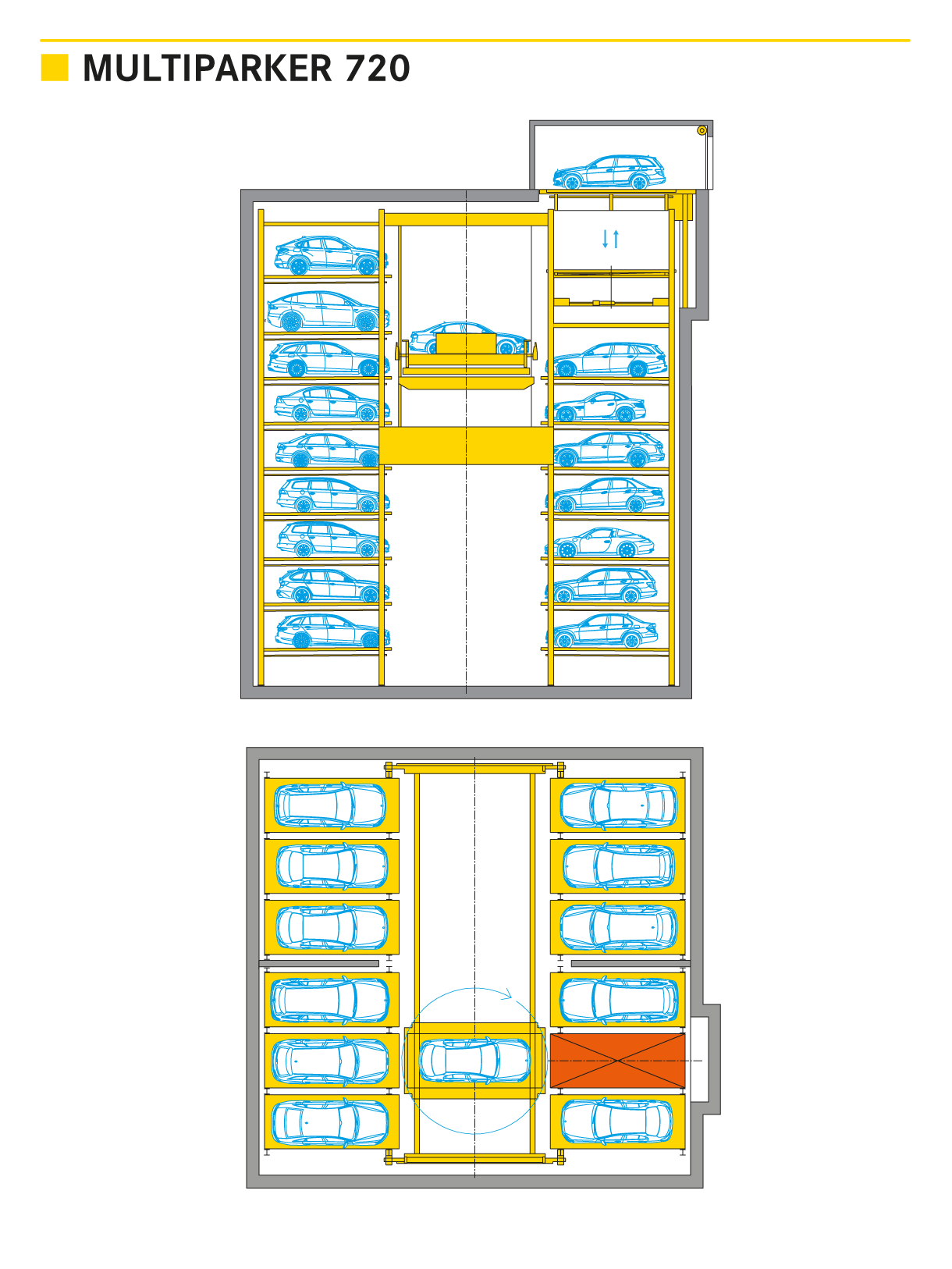 Le Multiparker 720 utilise la surface disponible avec un transstockeur desservant un rack et convient particulièrement aux bâtiments hauts. Le transport des véhicules est effectué latéralement. L'utilisation d'un dispositif de rotation optionnel permet de tourner déjà le véhicule dans le sens de la sortie pendant les mouvements de déplacement et de levage.
