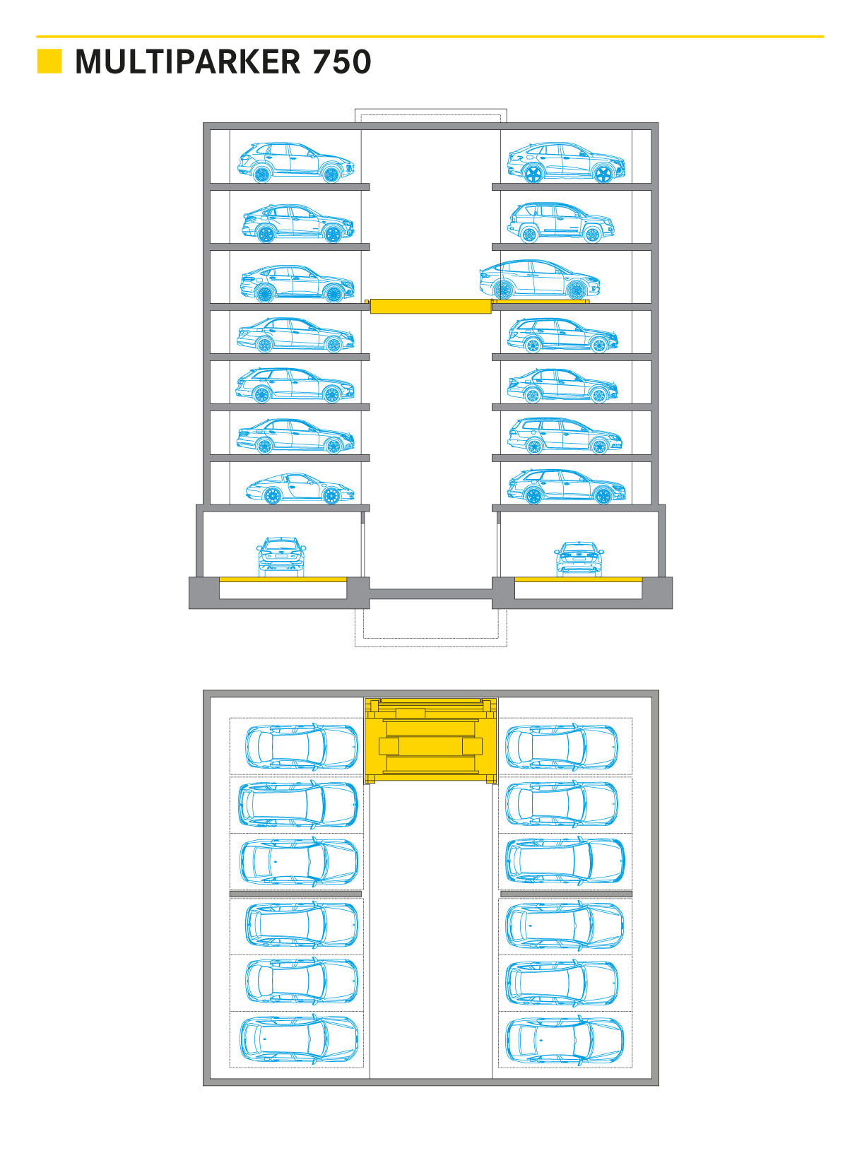 Le Multiparker 750, un rack réalisé en infra ou superstructure, offre des places de stationnement dans une structure béton. Cette solution est souvent d'un prix plus avantageux, en particulier pour les constructions en infrastructure. Jusqu'à 30 niveaux de parking peuvent être créés, même sur les petites superficies. Un ou plusieurs sas de transfert desservent le rack par un système associant convoyeur vertical et navette. Un convoyeur vertical situé à l’extrémité du système transporte une navette jusqu’au niveau de parking respectif. Une fois le niveau atteint, le véhicule positionné sur un système de transfert longitudinal (LAT) est convoyé horizontalement par la navette jusqu’à la place de stationnement vide où il est alors rangé par le LAT. Les véhicules sont déposés directement sur un faux-plafond en béton, sans autre dispositif.