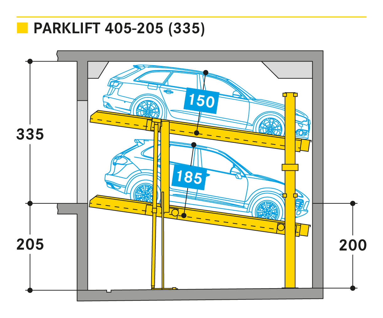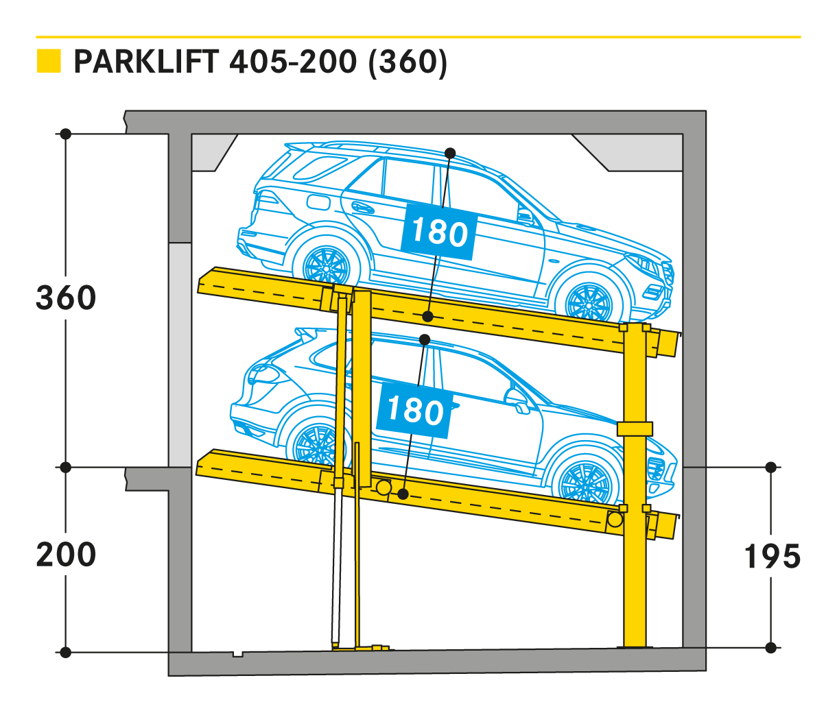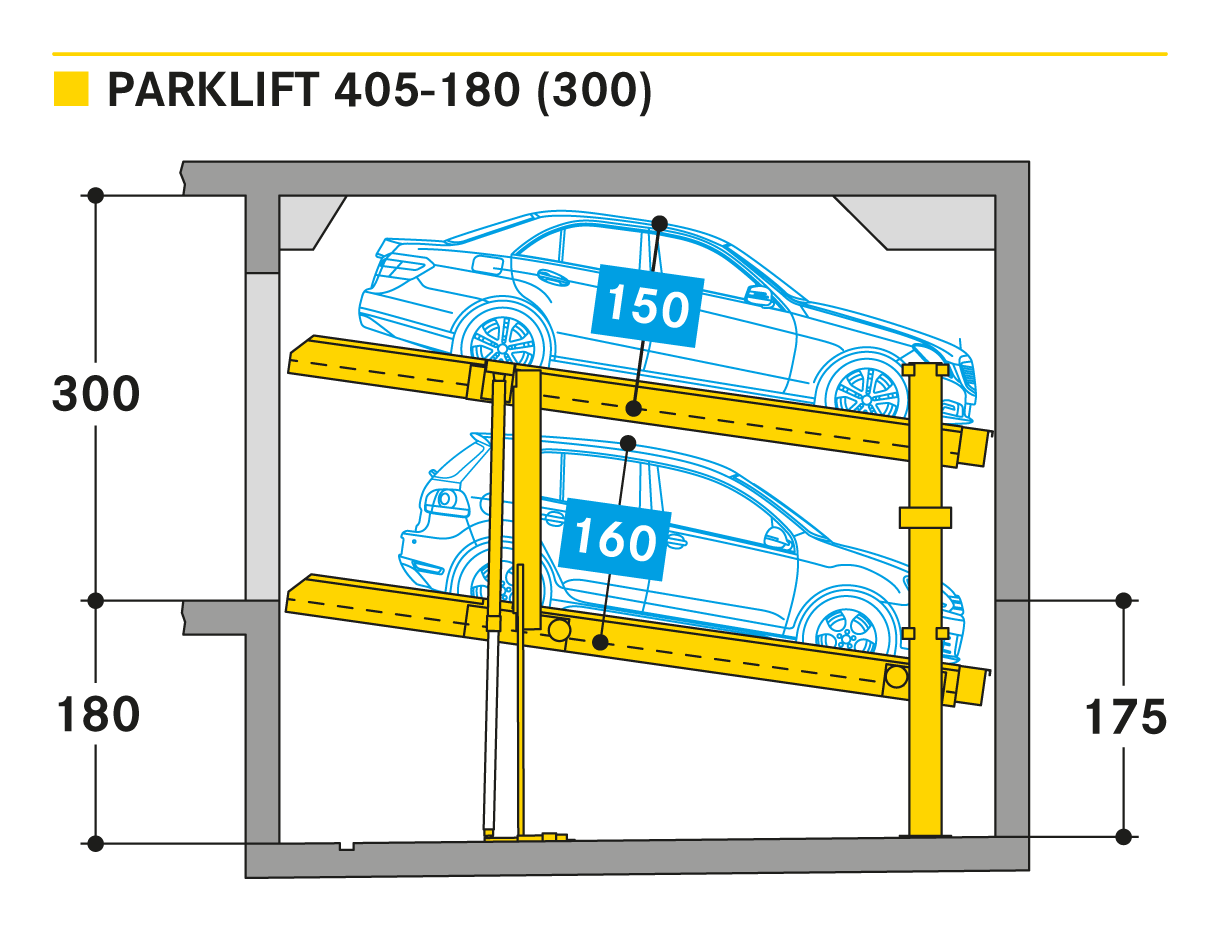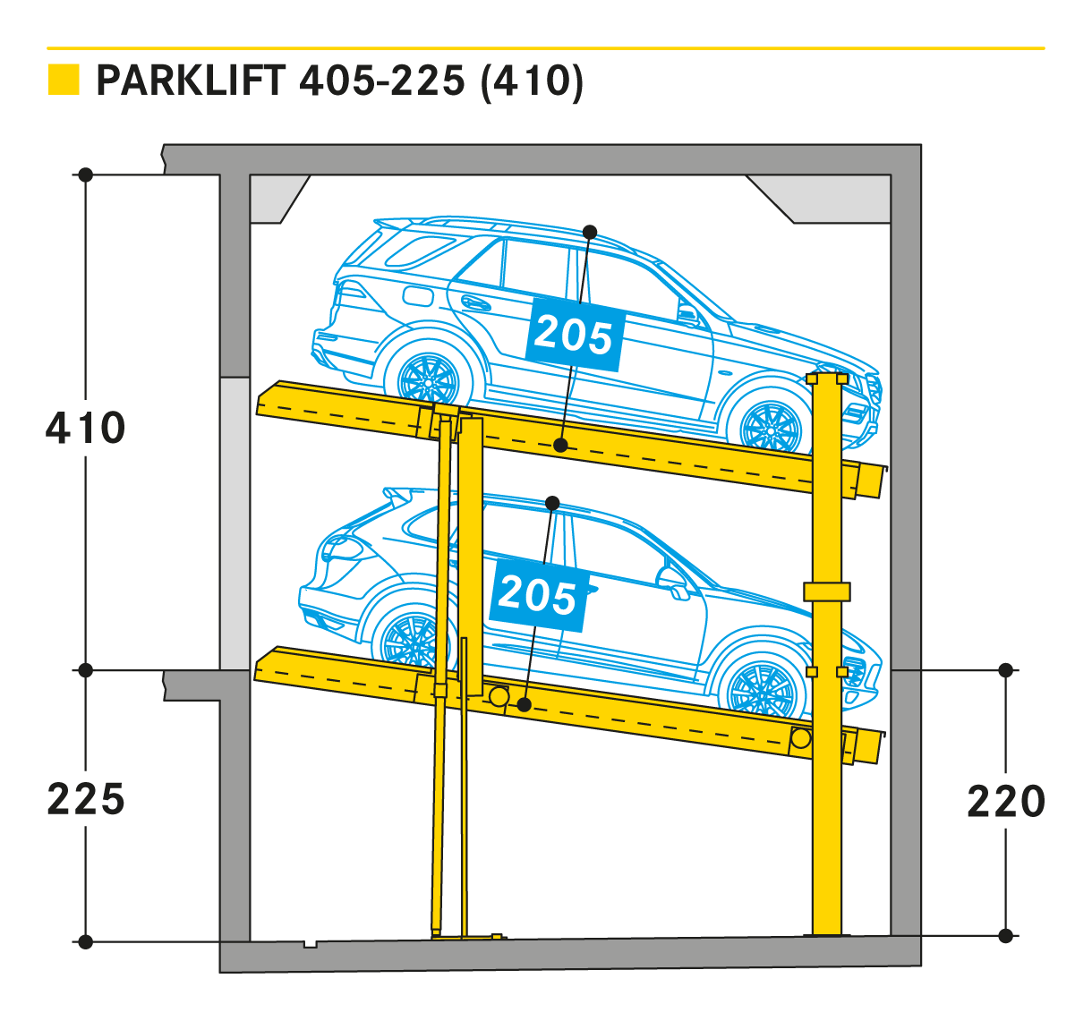 Le Parklift 405 arrive sur le marché en présentant les mêmes développements que le Parklift 450 et se distingue, de surcroît, par un autre atout. Il peut abriter les véhicules ayant les mêmes dimensions que celles du Parklift 450 avec une hauteur sous plafond encore plus réduite, la place de stationnement inférieure étant accessible en position inclinée. C’est la réaction aux dimensions toujours croissantes des voitures et aux espaces de stationnement de plus en plus réduits.La plateforme inférieure est accessible en position inclinée de 14%. La plateforme supérieure a une inclinaison minimale de 2% facilitant l’écoulement des eaux de la place de stationnement supérieure. L’installation simple est conçue pour 2 voitures, l’installation double pour 4 voitures.
