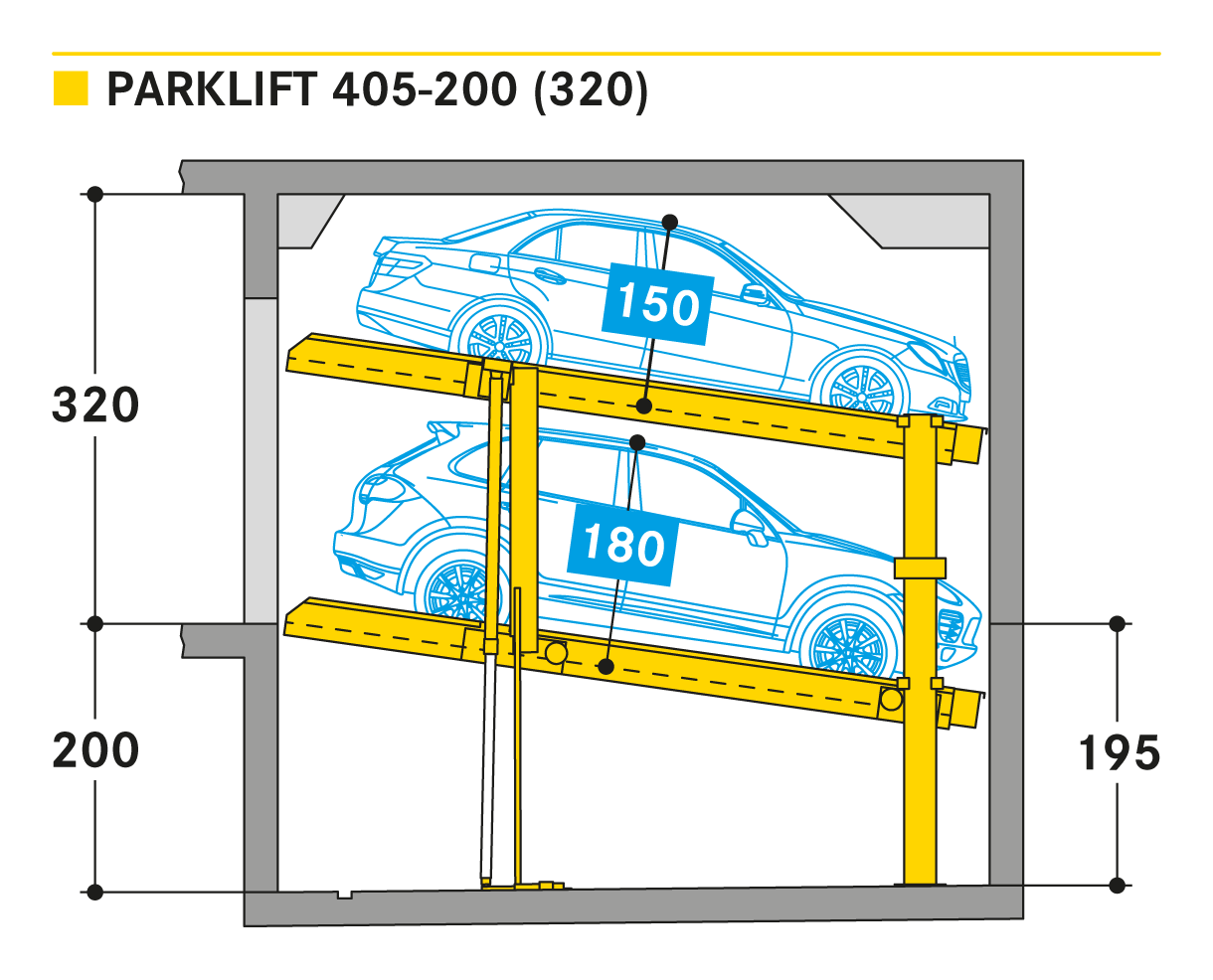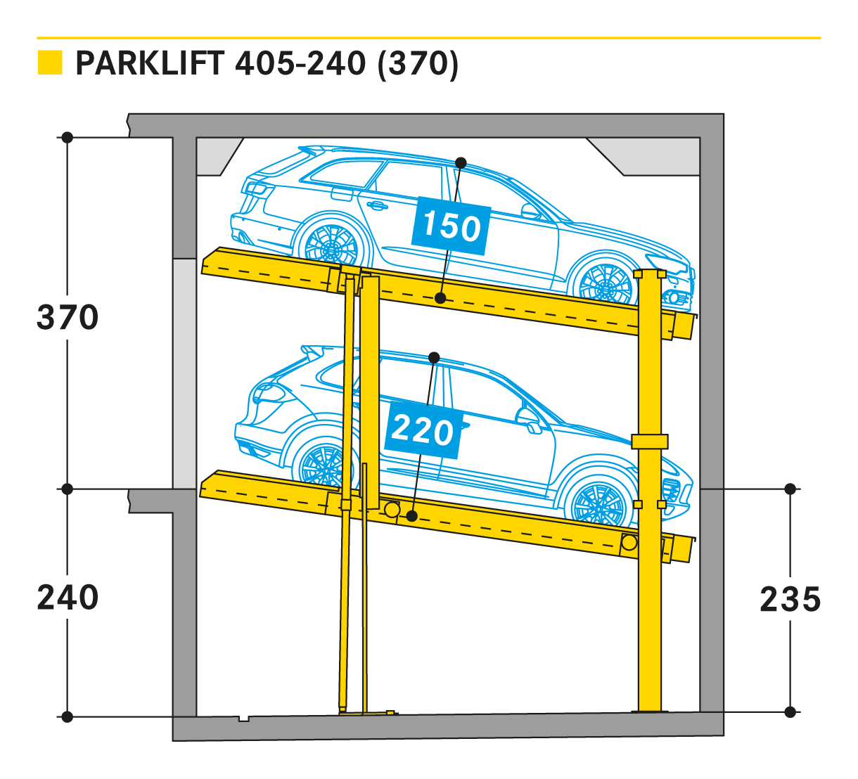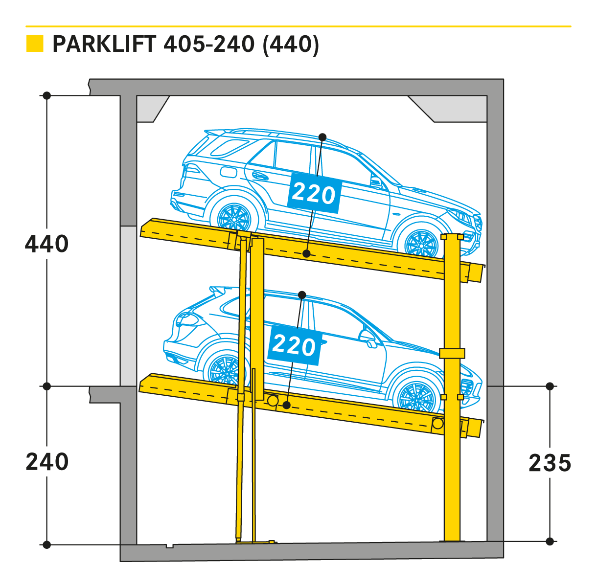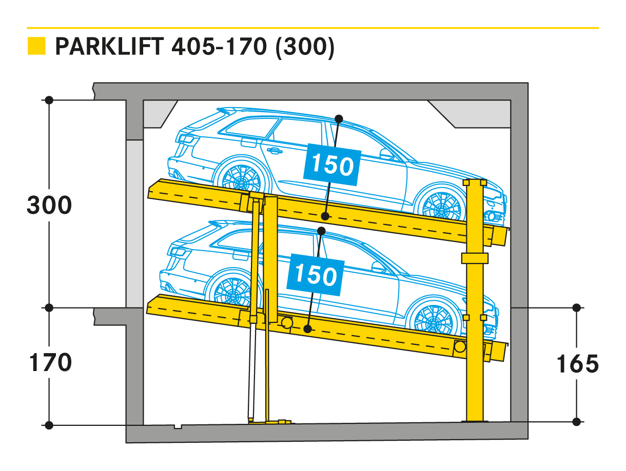 Le Parklift 405 arrive sur le marché en présentant les mêmes développements que le Parklift 450 et se distingue, de surcroît, par un autre atout. Il peut abriter les véhicules ayant les mêmes dimensions que celles du Parklift 450 avec une hauteur sous plafond encore plus réduite, la place de stationnement inférieure étant accessible en position inclinée. C’est la réaction aux dimensions toujours croissantes des voitures et aux espaces de stationnement de plus en plus réduits.La plateforme inférieure est accessible en position inclinée de 14%. La plateforme supérieure a une inclinaison minimale de 2% facilitant l’écoulement des eaux de la place de stationnement supérieure. L’installation simple est conçue pour 2 voitures, l’installation double pour 4 voitures.