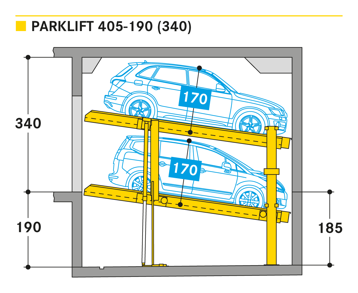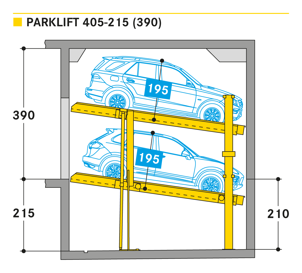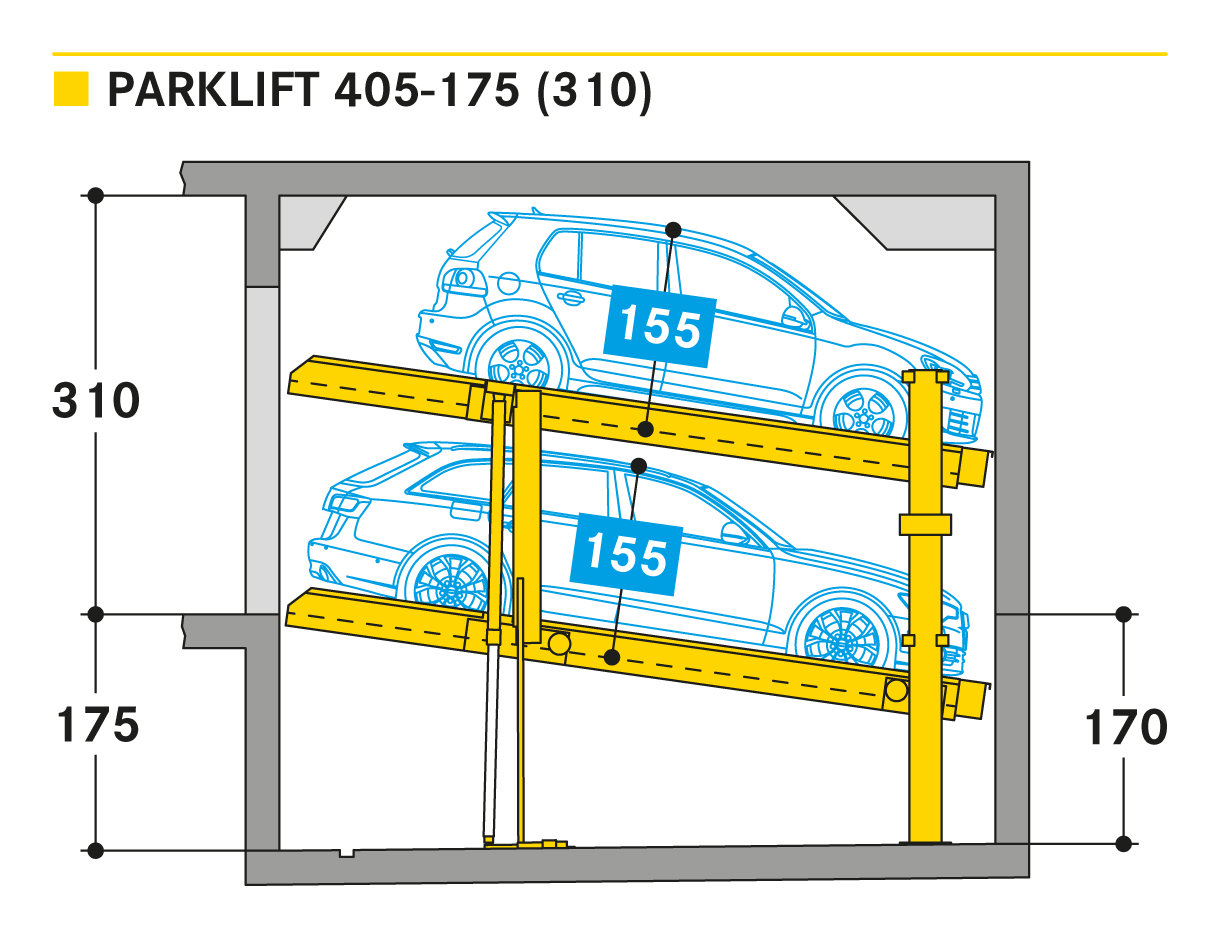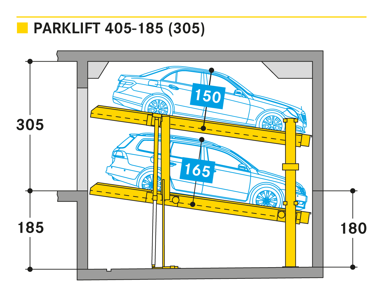 Le Parklift 405 arrive sur le marché en présentant les mêmes développements que le Parklift 450 et se distingue, de surcroît, par un autre atout. Il peut abriter les véhicules ayant les mêmes dimensions que celles du Parklift 450 avec une hauteur sous plafond encore plus réduite, la place de stationnement inférieure étant accessible en position inclinée. C’est la réaction aux dimensions toujours croissantes des voitures et aux espaces de stationnement de plus en plus réduits.La plateforme inférieure est accessible en position inclinée de 14%. La plateforme supérieure a une inclinaison minimale de 2% facilitant l’écoulement des eaux de la place de stationnement supérieure. L’installation simple est conçue pour 2 voitures, l’installation double pour 4 voitures.