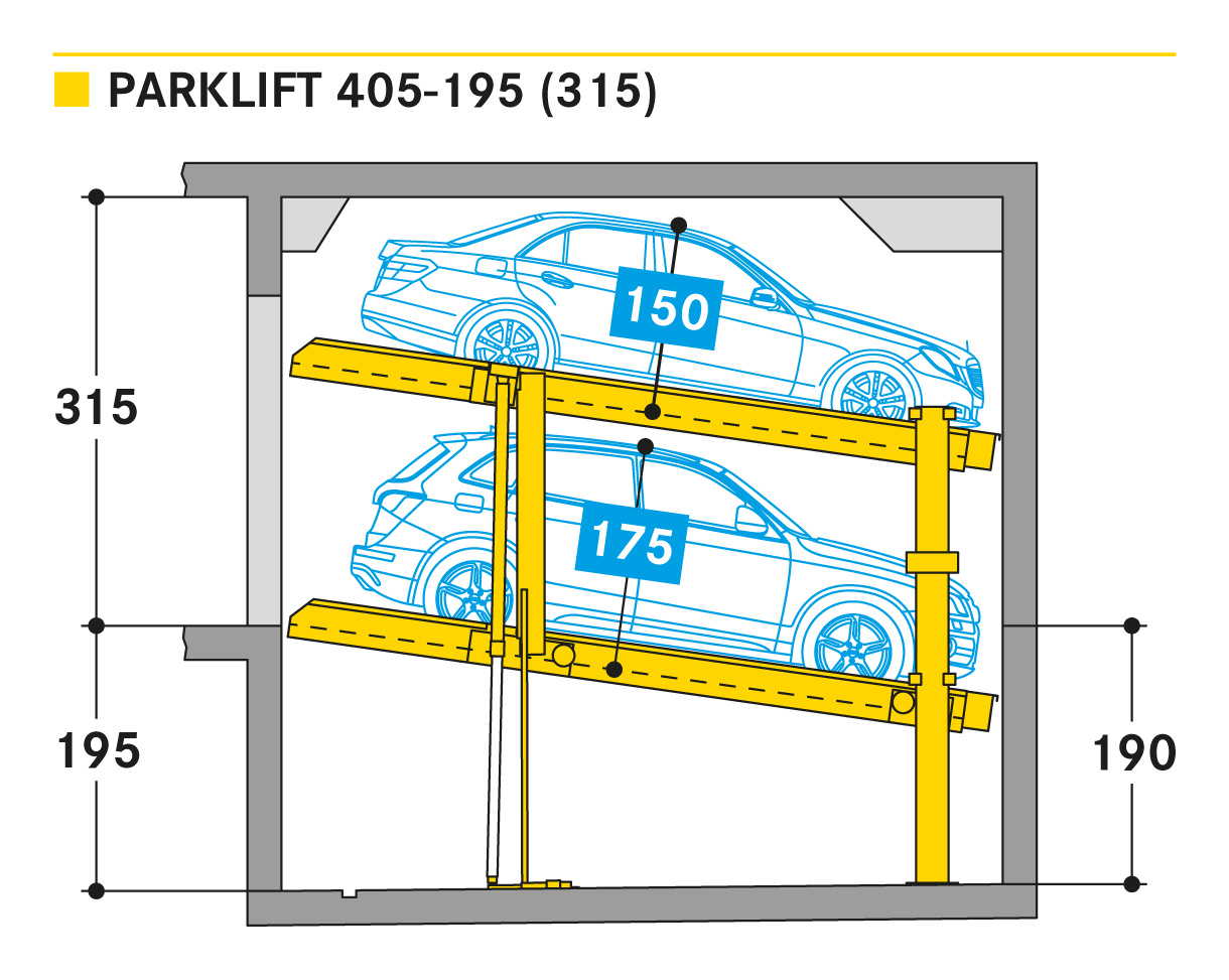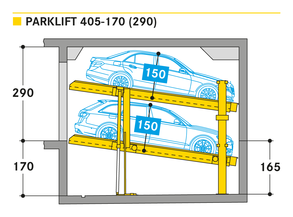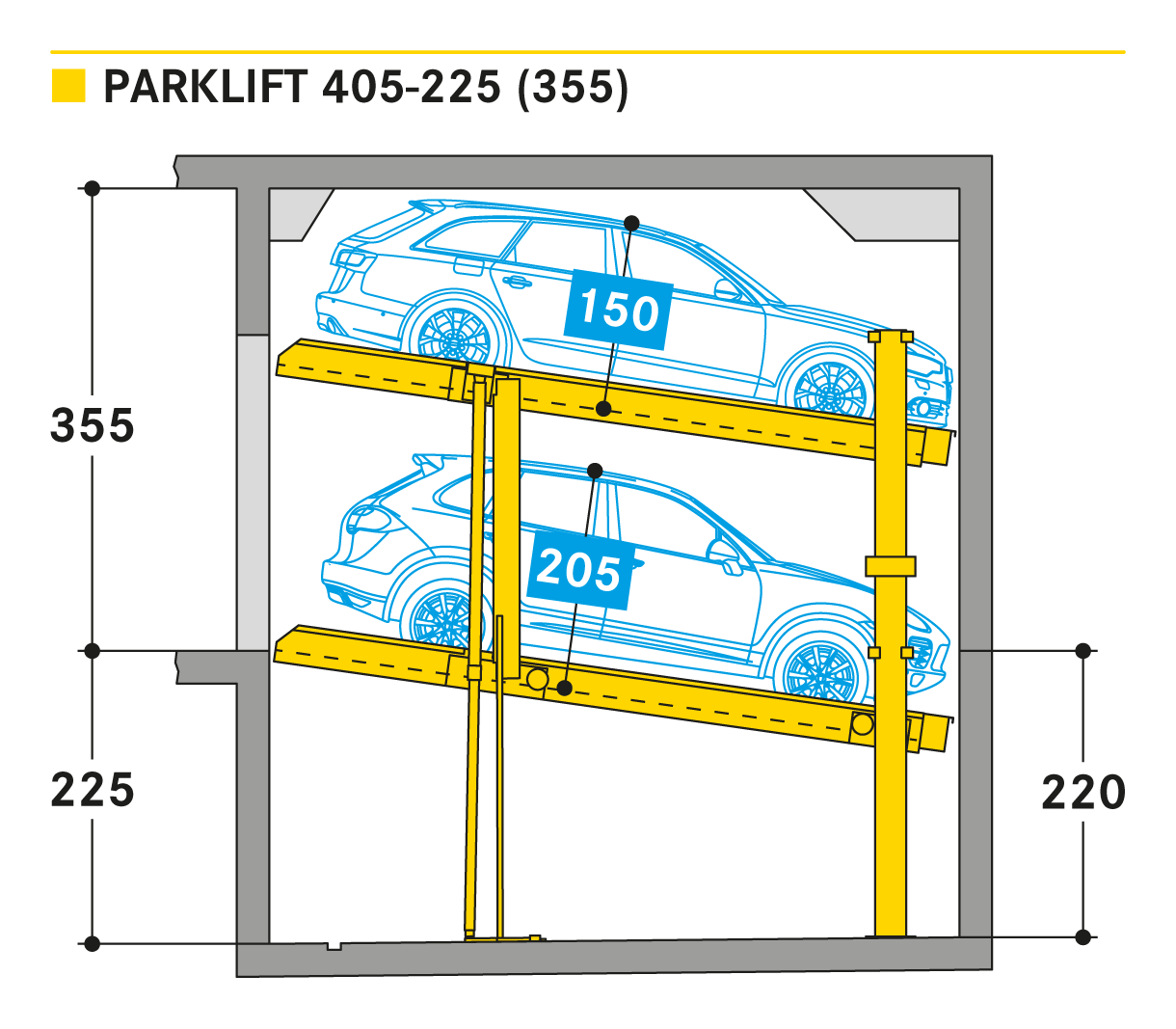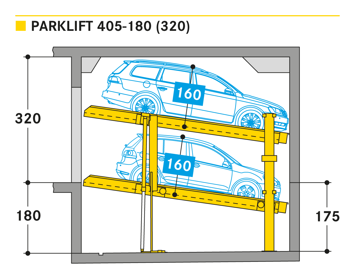Le Parklift 405 arrive sur le marché en présentant les mêmes développements que le Parklift 450 et se distingue, de surcroît, par un autre atout. Il peut abriter les véhicules ayant les mêmes dimensions que celles du Parklift 450 avec une hauteur sous plafond encore plus réduite, la place de stationnement inférieure étant accessible en position inclinée. C’est la réaction aux dimensions toujours croissantes des voitures et aux espaces de stationnement de plus en plus réduits.La plateforme inférieure est accessible en position inclinée de 14%. La plateforme supérieure a une inclinaison minimale de 2% facilitant l’écoulement des eaux de la place de stationnement supérieure. L’installation simple est conçue pour 2 voitures, l’installation double pour 4 voitures.