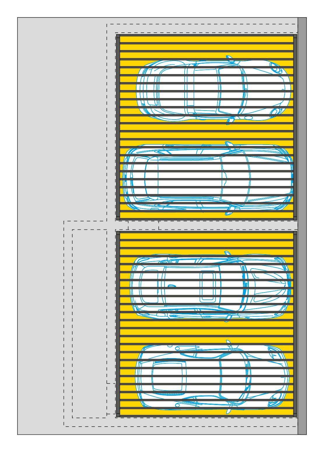 Pour entrer et sortir facilement dans la voiture, les largeurs de la plateforme des Parklift ont été étendues, à la demande du client, de la largeur standard de 500 cm à une largeur de 540 cm. Le système de parking mécanique Parklift 461-2,6 D est aussi simple à utiliser que d’habitude : sur deux niveaux, deux places de stationnement à l’horizontale sont respectivement disponibles sur chaque Parklift. Le niveau de stationnement inférieur horizontal s’abaisse complètement dans le sol. Le niveau supérieur s’arrête à la hauteur du sol et est recouvert, comme toute l’entrée de la cour, de dalles en grès clair. Le résultat est une avant-cour représentative et bien agencée, qui protège et met parfaitement en valeur les véhicules de grande qualité des propriétaires.