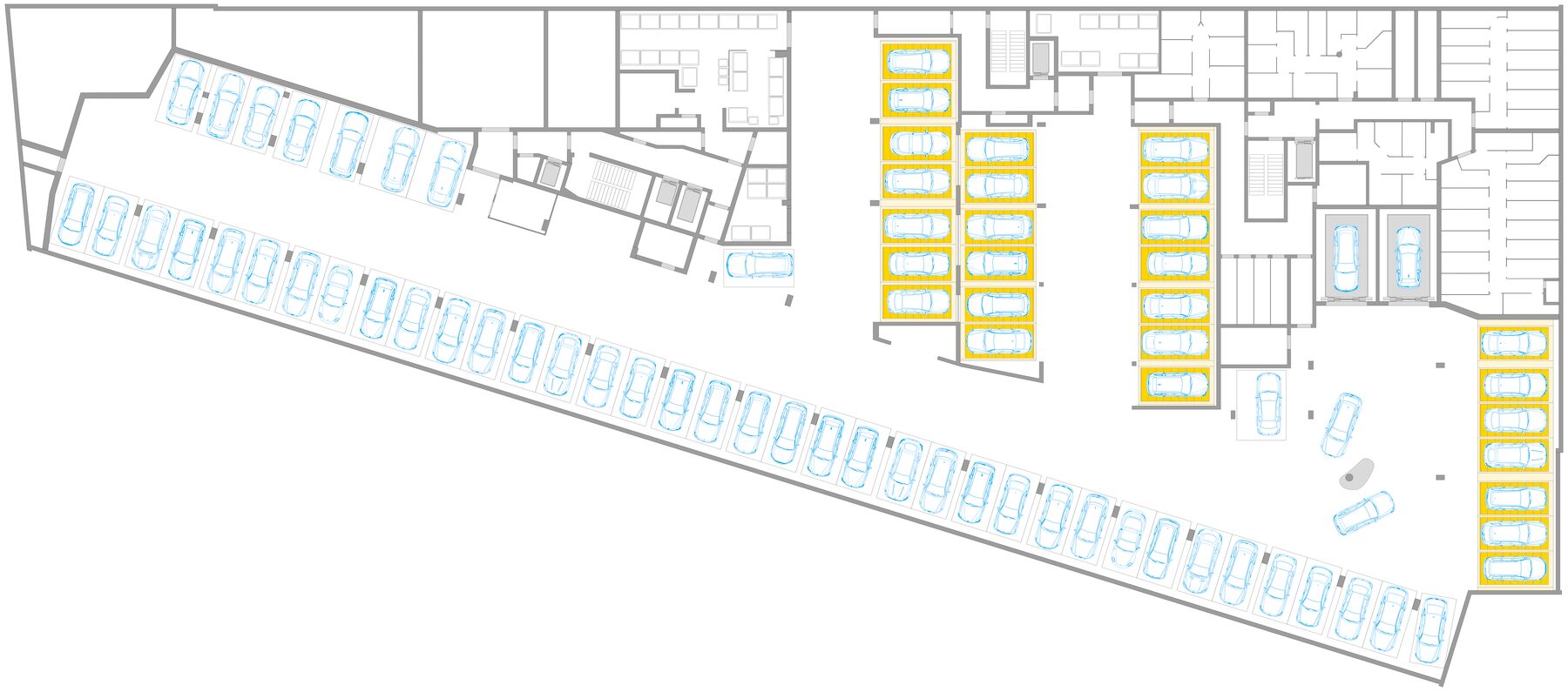 Au sous-sol, un parking souterrain commun de près de 100 places a été construit, accessible par deux ascenseurs pour voitures. 50 places de stationnement sont disposées de manière peu encombrante dans quatre systèmes semi-automatiques WÖHR Combilift 551. Des espaces sont également disponibles pour le covoiturage. La réduction du nombre de places de stationnement à 0,4 par unité d'habitation et l'utilisation des systèmes compacts WÖHR soutiennent la stratégie de mobilité durable du quartier et contribuent à la réduction des coûts de construction.