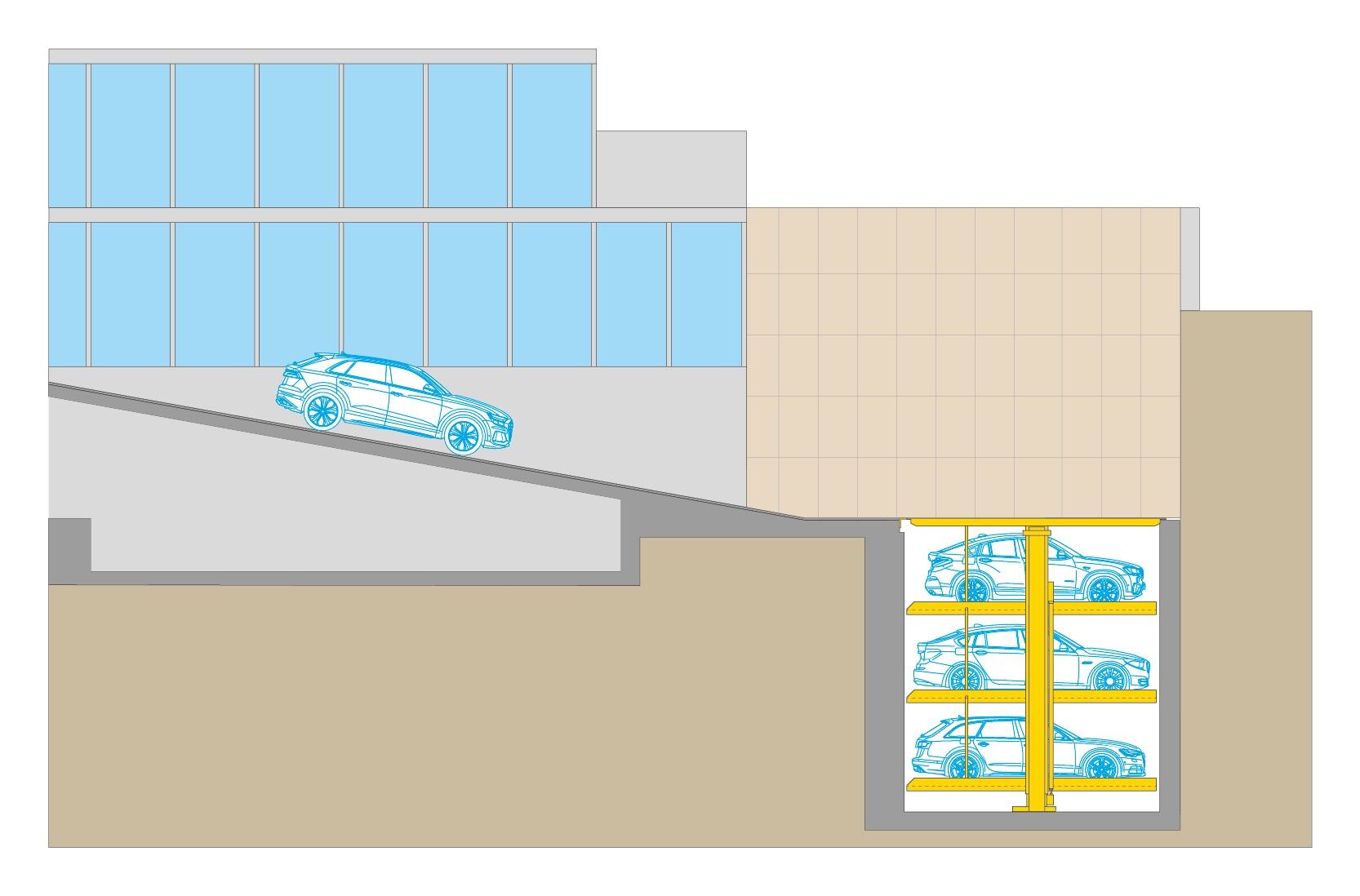 Comme c’est souvent le cas dans un écoprojet, les élévateurs pour parking ont également été équipés de bornes de recharge électriques. Le revêtement de la plaque de recouvrement a été adapté au revêtement de sol de la zone extérieure pour rendre les élévateurs de parking invisibles en dehors des processus de stationnement. Le véritable point fort du projet réside dans le fait que l’enveloppe en béton des élévateurs de parking fonctionne comme un échangeur de chaleur géothermique permettant d’obtenir de l’énergie supplémentaire pour la climatisation du complexe. Une idée « rafraîchissante » pour se garer en toute décontraction sous le soleil brûlant de Madrid