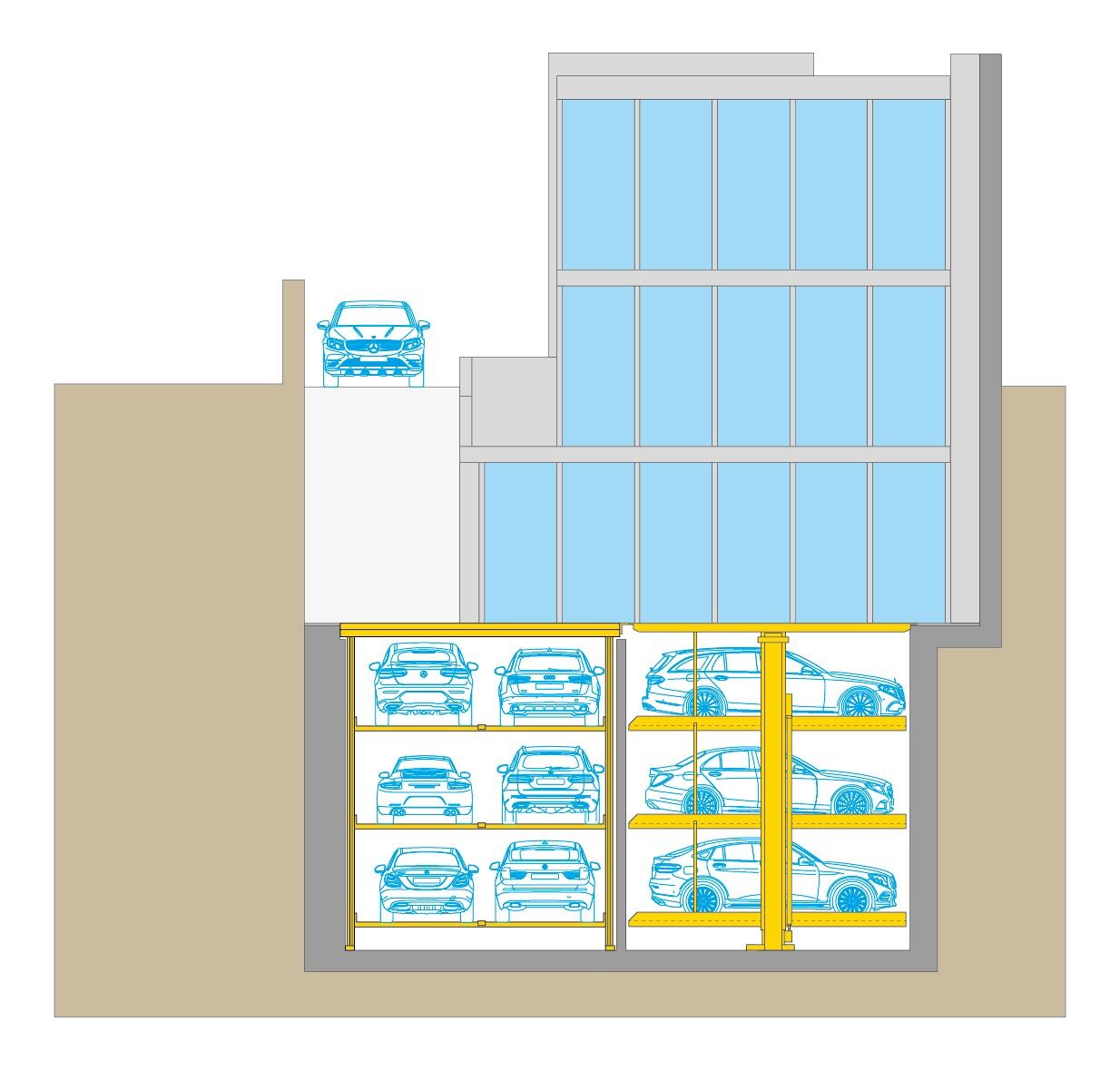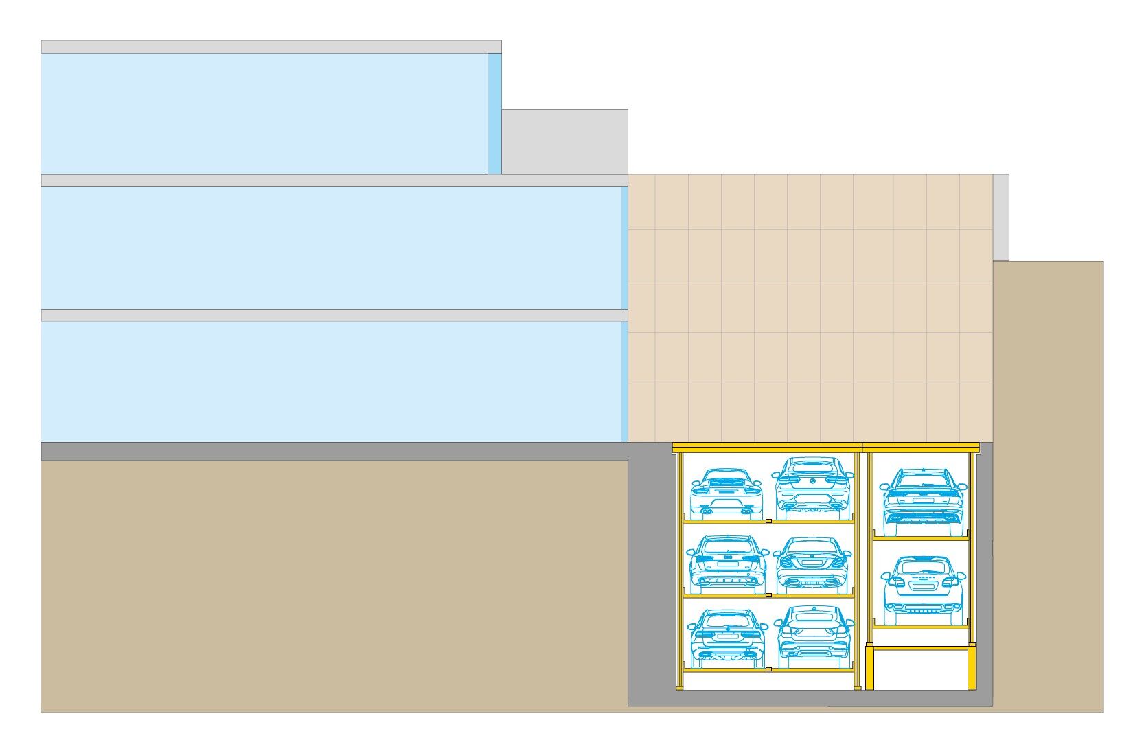 En fait, le bâtiment est un excellent exemple de construction écoénergétique et respectueuse de l’environnement. La ventilation et la climatisation des locaux sont assurées, par exemple, par l’énergie géothermique et l’énergie solaire thermique. Une nouvelle solution de stationnement peu encombrante et économe en énergie fait également partie du concept de rénovation. En raison des conditions climatiques de Madrid, il fallait une solution souterraine et intégrée au circuit de climatisation du bâtiment. WÖHR a été choisi en tant que partenaire innovant pour cette tâche exigeante. Deux élévateurs pour parking mécaniques doubles escamotables de la série de modèles 463-2.0 D avec douze places de stationnement sur trois niveaux et un élévateur simple 462-2.3 E avec deux places de stationnement sur deux niveaux ont été sélectionnés. Les niveaux de stationnement peuvent être horizontaux.