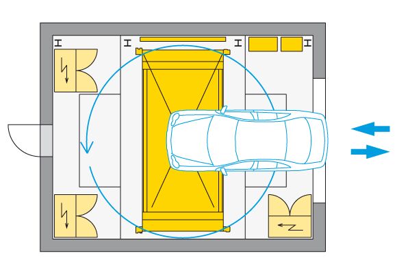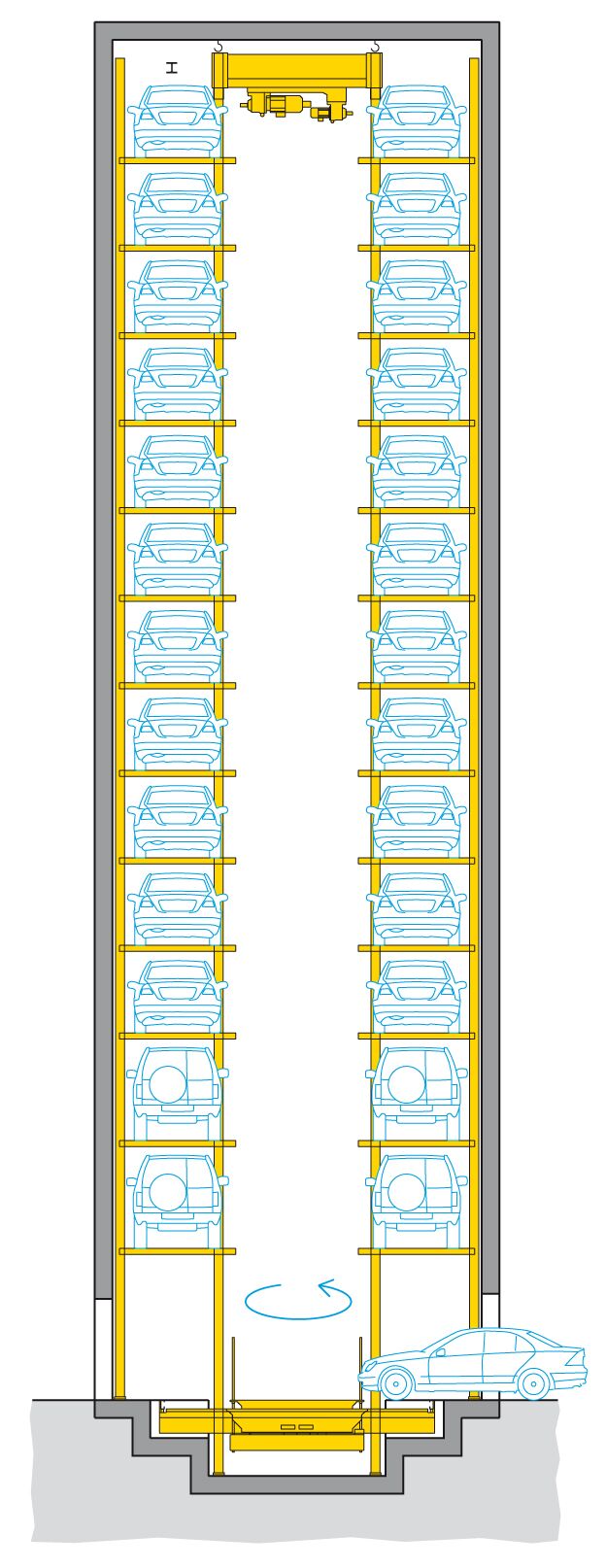 Ici le Parksafe 580 est synonyme d’une solution innovatrice pour les problèmes de parking. Sur une surface de seulement 7,30 x 5,80 m (ce qui représente tout juste une surface de 1,6 m² par emplacement de parking) 26 emplacements de parking au-dessus du sol ont été créés. Un élévateur vertical central assure le transport des véhicules à partir de la cabine d’accès et permet d’accéder à 13 niveaux de parking.