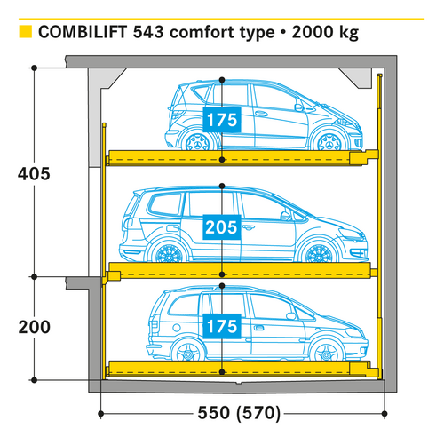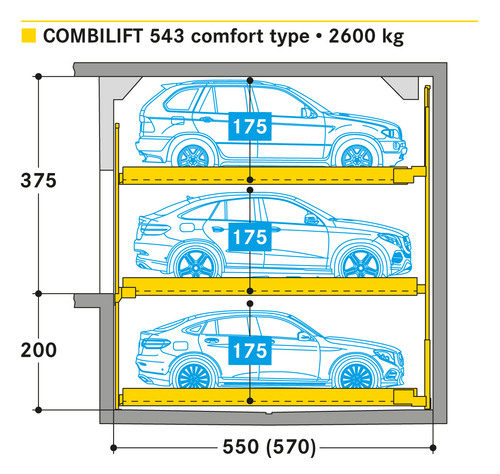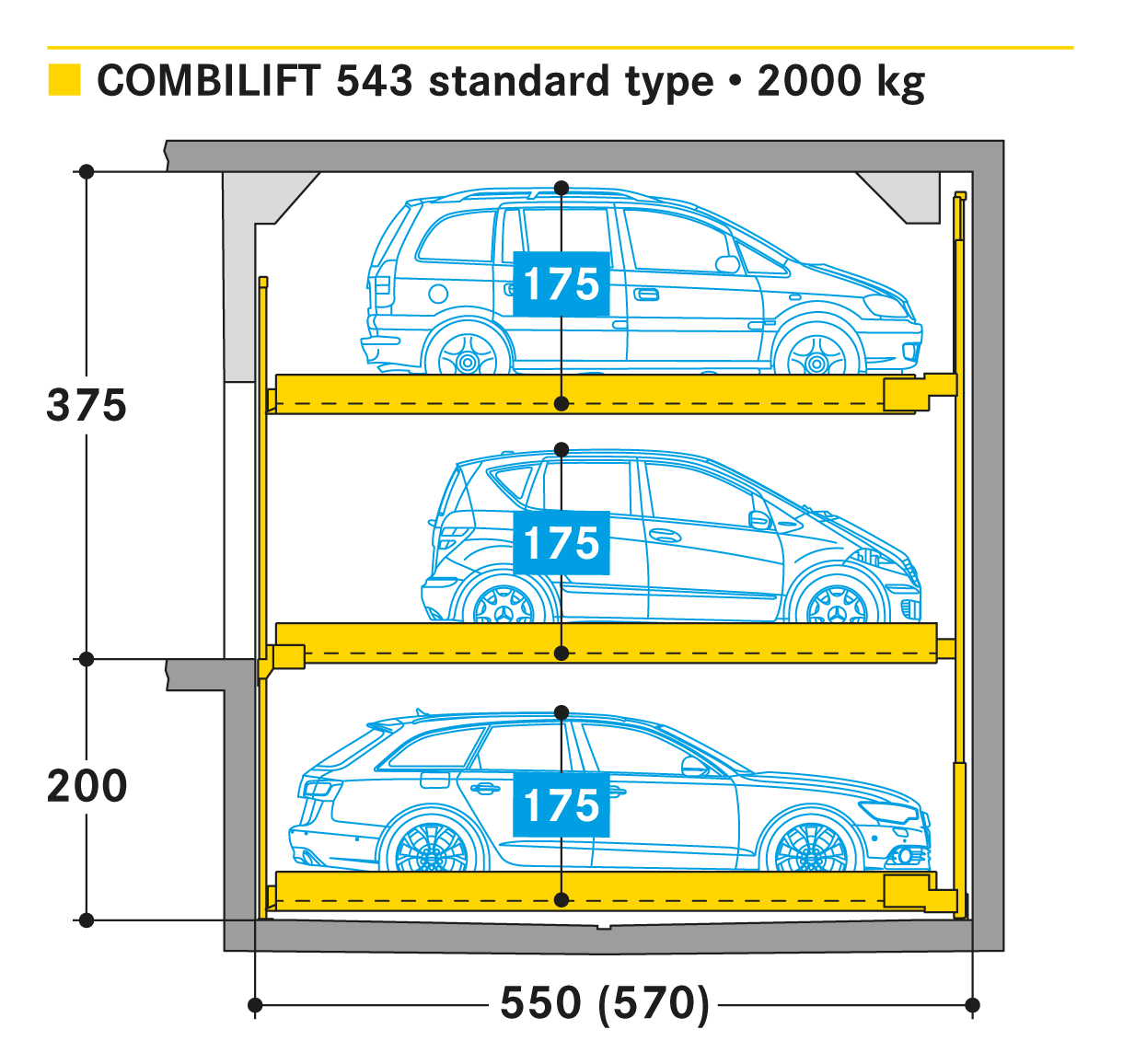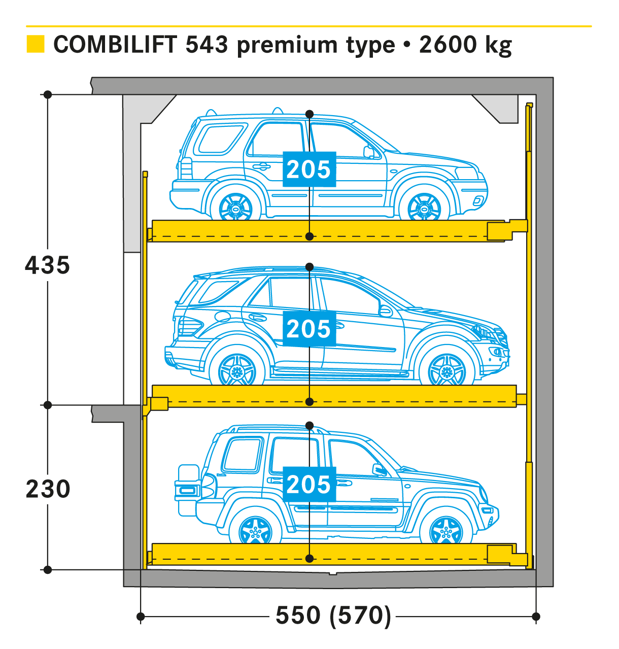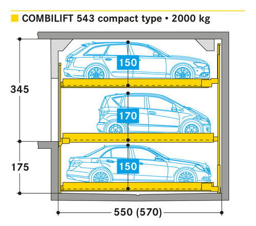 De meest compacte, plaatsbesparende combilift voor het parkeren op 3 niveaus boven elkaar. De inrit bevindt zich altijd op het centrale niveau. Er kunnen 10 roosters naast elkaar geplaatst worden. De gebruiker kiest zijn plaats via het bedieningspaneel of de afstandsbediening. De auto's worden veilig geparkeerd achter schuifdeuren die pas geopend kunnen worden als de gewenste parkeerplaats de gewenste positie heeft bereikt.
