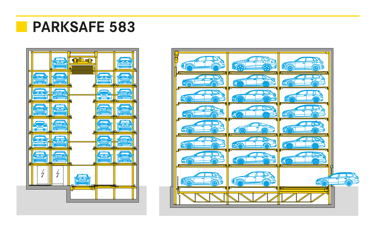 De Parksafe 583 is een automatisch bestuurd parkeersysteem met één centrale verticale lift en opslagrekken die rechts of links van de verticale lift zijn geplaatst. Toren-, put- of toren-/putconfiguraties met transferruimte op basis-, boven- of tussenniveau. Plaatsing van 1 tot 3 parkeerrijen rechts of links van de vertikale lift is mogelijk. De Parksafe maakt hellingen en opritten overbodig, biedt veiligheid en beveiliging tegen diefstal, schade en vandalisme en is milieuvriendelijk door zijn compacte constructie en verminderde uitstoot van uitlaatgassen.