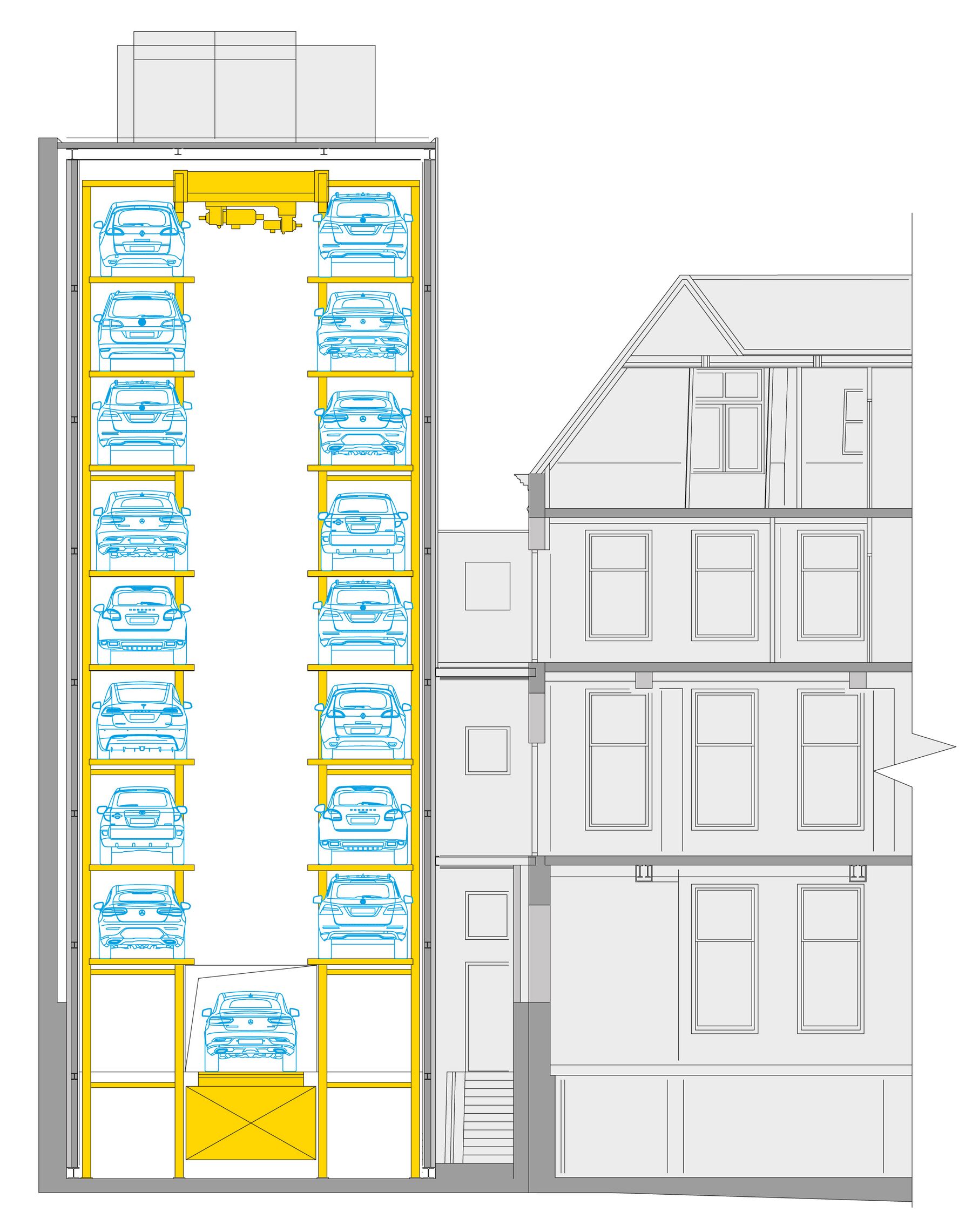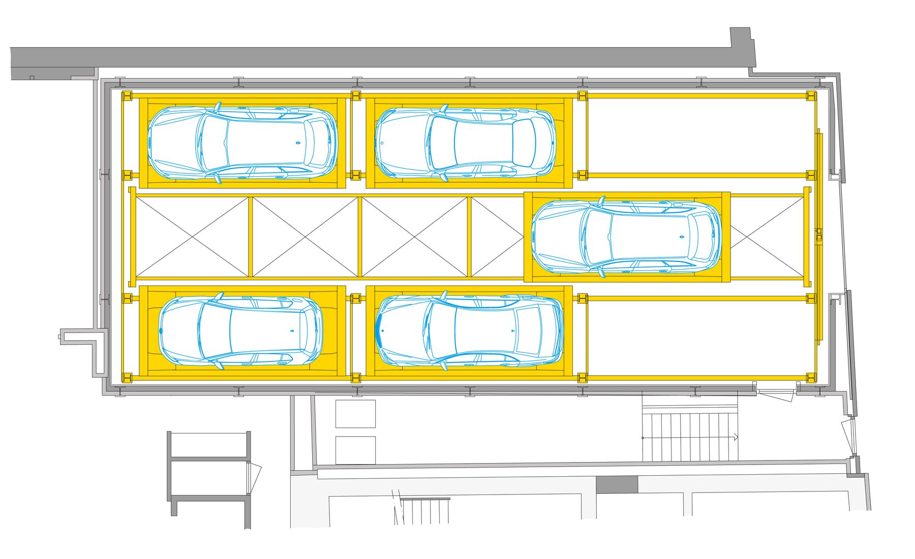 Naast het onderhoud van de historische bouwmaterialen is de aandacht voor detail, die overal in het gebouw zichtbaar is, ook terug te vinden in ons parkeersysteem. Door een groot raam achter zijn bureau kan de bouwheer het parkeersysteem en zijn favoriete auto uit Stuttgart altijd in de gaten houden. Het voertuig wordt altijd precies op die plek geplaatst en wordt met speciale lichtaccenten geaccentueerd. Dit is een zeer bijzonder project, besteld door een zeer speciale bouwheer.