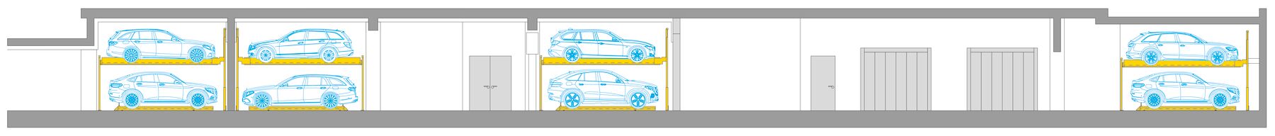 A shared underground car park with almost 100 parking spaces was built in the basement, accessed via two car lifts. Fifty parking spaces are arranged in a space-saving manner in four semi-automatic WÖHR Combilift 551 systems. Additional space is available for car sharing. The reduced parking space ratio of 0.4 per residential unit and the use of compact WÖHR systems support the neighborhood's sustainable mobility strategy and contribute to reducing construction costs.