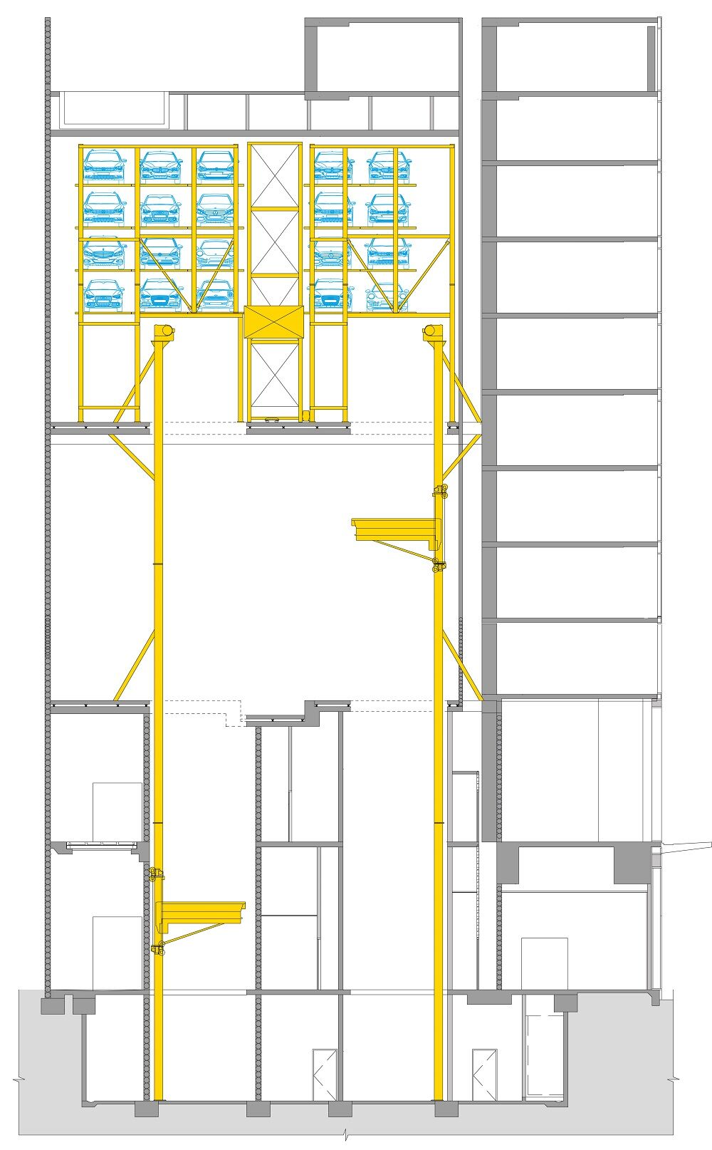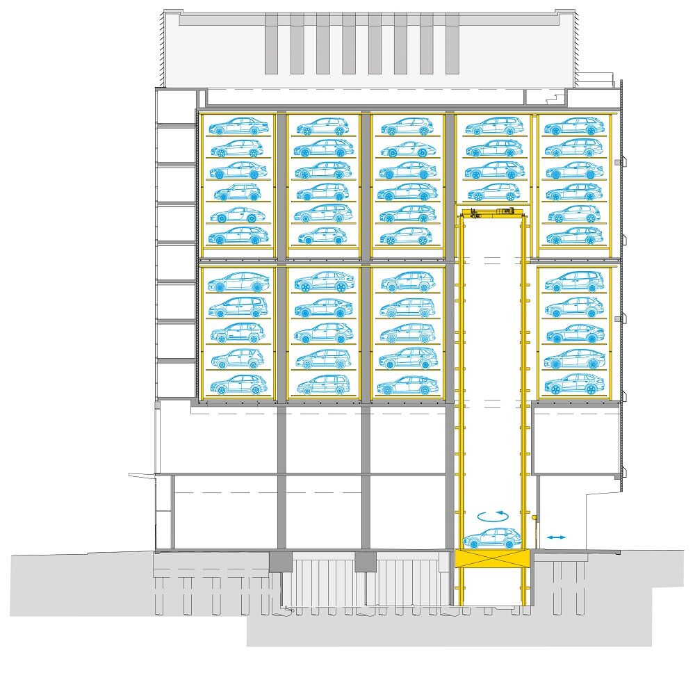 De blikvanger van de wolkenkrabber: Ons parkeersysteem, dat 30 - 47 parkeerfuncties kan uitvoeren met twee transfercabines. De Multiparker 740 stapelt auto's met hoogtes tussen 160 en 200 cm op 11 niveaus. De totale hoogte van het stalgedeelte bedraagt ong. 25 meter, gerekend vanaf ong. 12 meter boven het grondniveau. De parkeerprocedures worden bediend met een RFID-chip op het bedieningspaneel dat zich bij de transferzone bevindt.