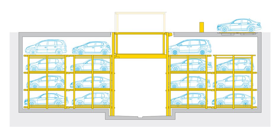 Dit nieuwe parkeersysteem biedt een succesvolle oplossing voor het beschikbaar stellen van parkeerplaatsen onder deze tussenliggende gebieden, die vaak smal maar vrij lang zijn. Ook is het vaak verboden om over deze gebieden heen te bouwen, daarom wordt het transferplatform dat nodig is om de voertuigen in en uit te parkeren eenvoudig opgetild en vervolgens "onzichtbaar" weer naar beneden gebracht. Het platformdeksel kan overreden en vrij geconfigureerd en ontworpen worden in de omgeving, met een stenen vloer en/of asfalt. Er zijn geen hellingbanen en trappen nodig, zodat elk systeem plaats biedt aan een veilige en beveiligde ondergrondse parkeergarage voor maximaal 23 voertuigen, zonder dat dit ten koste gaat van de groene zones erboven.